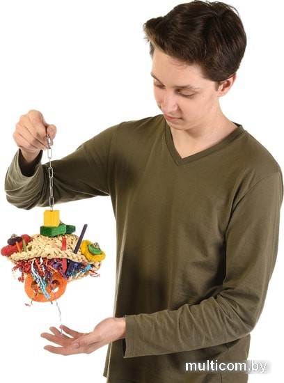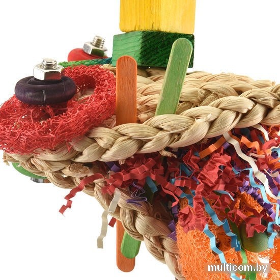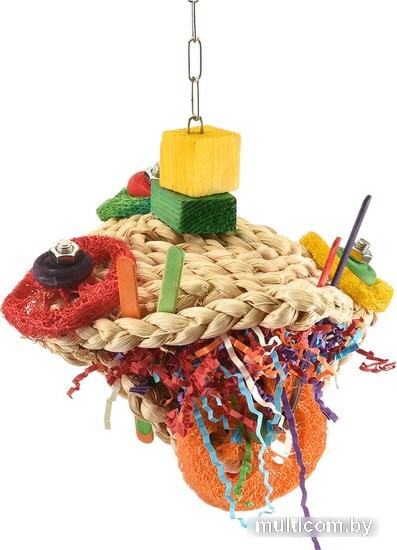 | Информация | Подвесная игрушка в основе которой два мата из плетенной кукурузной соломки, которые скреплены между собой тремя винтами из нержавеющей стали, игрушка заполнена резаной бумагой, деревянными палочками и брусочками, а также натуральной люфой. |