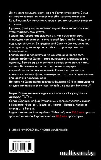 | Информация | ? Романтическая история о любви с чувственными эротическими сценами. ? Данте всего тридцать шесть, но его боятся и уважают в Семье, и в скором времени он станет главой чикагской отделения Коза Ностры. ?? Он печально известен тем, что всегда получает то, что хочет. ? Валентина Ареско потеряла мужа и как послушная дочь вынуждена согласиться на договорной брак, чтобы находиться под защитой Семьи. ? Валентина не интересует Данте как женщина, более того, Валентина боится Данте — этого пугающего, хладнокровного мужчину. ? Вскоре страх переходит в замешательство, а потом и в гнев. ? Валентина устала от того, что ее игнорируют и пренебрегают как женщиной. ? Она полна решимости привлечь внимание Данте, несмотря на то, что его сердце все еще принадлежит покойной жене. |