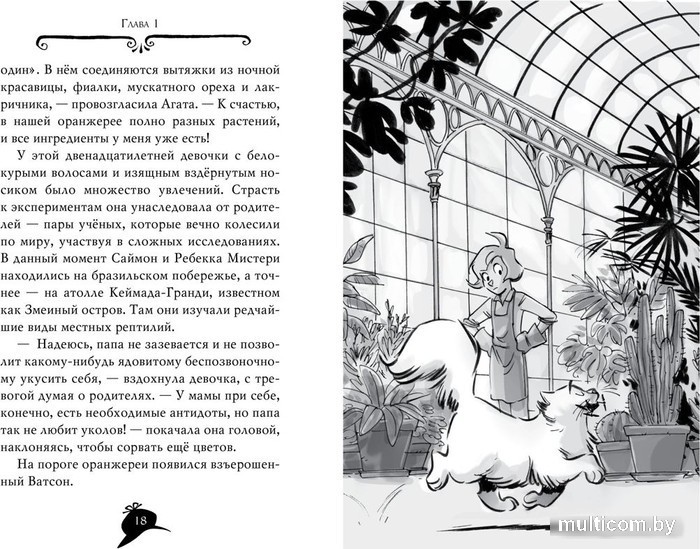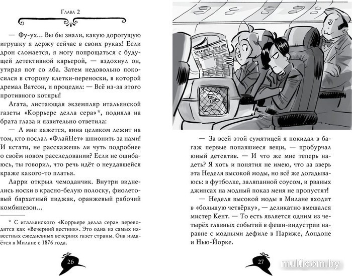 | Информация | Наделённая потрясающим чутьём и феноменальной памятью, Агата Мистери мечтает стать писательницей. Но это в будущем, а пока она просто превосходная сыщица! Вместе со своим незадачливым кузеном Ларри, студентом детективной школы, она путешествует по миру, чтобы решать самые запутанные загадки. А помогают им преданный дворецкий, вредный сибирский кот и множество чудаковатых родственников. Модные интриги в Милане. Ларри Мистери счастлив, ведь именно ему поручили опробовать суперсовременный дрон – последнюю разработку детективного агентства «Око Интернешнл». Правда, проводить испытания он планировал у себя дома, а не на подиумах миланской Недели высокой моды! Но долг зовёт: уникальное платье всемирно известного модельера едва не похитили накануне показа, и Ларри должен вывести злоумышленника на чистую воду, конечно, не без помощи своей наблюдательной сестры Агаты. Ребята срочно вылетают в Италию, чтобы расследовать это загадочное происшествие. Однако дело внезапно оказывается гораздо серьёзнее, чем они думали: неудавшийся воришка, без сомнения, собирается кого-то убить! Но кто за этим стоит и, самое главное, кого он избрал своей жертвой?.. Это и предстоит выяснить нашим героям. |