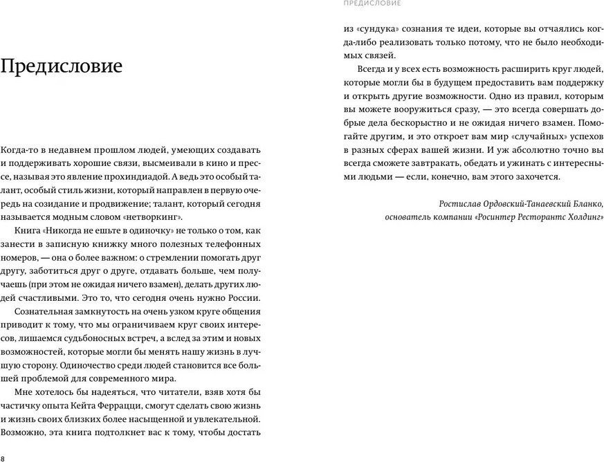 | Информация | - Простые и эффективные уроки нетворкинга от Кейта Феррацци, обладателя одной из самых обширных сетей контактов в мире, помогут вам освоить искусство общения и построения полезных знакомств. - Связи играют ключевую роль в успехе. В современном бизнесе, особенно для предпринимателей и менеджеров, умение открыто и искренне общаться с разными людьми становится важнейшим навыком. Люди, создающие крепкие сети взаимоотношений, всегда достигают успеха, ведь если вас знают и уважают, с вами охотнее будут сотрудничать. - Кейт Феррацци делится простыми и действенными правилами нетворкинга, раскрывая секреты построения взаимовыгодных связей как в бизнесе, так и в жизни. Он обучает, как устанавливать глубокие и прочные человеческие связи, что поможет вам укрепить свой бизнес, найти новых клиентов и партнеров, а также наставников и друзей, готовых поддержать ваши начинания. - Следуя рекомендациям из книги, вы не только реализуете свои амбиции, но и обогатите свою жизнь общением с интересными людьми. Это отличный способ расширить свои горизонты и найти единомышленников. - Книга станет незаменимым помощником для предпринимателей и руководителей, а также для всех, кто стремится к успеху и хочет развивать свои навыки нетворкинга. |