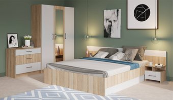 | Информация | Особенности:Спальня Алена выполнена в стиле минимализм – естественные цвета, текстура дерева, простота и функциональность. В комплекте Алена оптимальный набор функциональных модулей, который необходим для обустройства спальни: вместительный шкаф с полками и штангой, комод с ящиками, кровать с крепким и надежным основанием из ламинированной плиты и прикроватные тумбы. Кровать с двух сторон идеально дополняют идентичные по стилю прикроватные тумбы с высокой стенкой на одном уровне с изголовьем кровати – это создает визуальную целостность, добавляет ощущение защищенности. Мебель выполнена из высококачественных материалов. В спальне два варианта прямых шкафов с распашной конструкцией дверей, силиконовыми отбойниками, полками и металлической штангой, их можно приобрести отдельно или дополнить комплект. Комод: три выдвижных ящика оснащены роликовыми направляющими. Верхний ящик комода разделен на три отдела для оптимальной организации хранения мелких предметов. Крышку комода можно использовать для декора или фотографий, или установить бытовую технику – телевизор, колонки. Легко превращается в туалетный столик, достаточно повесить над ним зеркало. Прикроватные тумбы: Высокая спинка тумбы декорирована вставкой контрастного цвета, расположена на одной высоте с изголовьем кровати - создает визуальную целостность, добавляет ощущение защищенности. Надставка на крышке тумбы увеличивает полезную площадь для хранения вещей, которые необходимы под рукой – телефон, очки, светильник или любимая книга Выдвижной ящик с роликовыми направляющими. Пластиковые ручки: широкая ручка в виде скобы удобно ложится в руку и надежно крепится к фасаду. Теплый серебристый цвет идеально сочетается с минималистическим дизайном спальни. Зеркала на фасадах: зеркальное полотно на центральных фасадах состоит из четырех прямоугольных сегментов. При желании его можно не крепить на фасад, а использовать для других интерьерных решений. Крепкое и надежное основание – настил из ЛДСП австрийского концерна Кроношпан. ЛДСП класса эмиссии Е1: корпус и фасады выполнены из ЛДСП австрийского концерна Кроношпан (класс эмиссии Е1 ) – безопасное сырье. Мебель из ЛДСП класса эмиссии Е1 допускается ставить в детских комнатах, школах и детских садах. Все детали мебели обработаны кромкой. Она надежно защищает края от ударов и механических воздействий. Ламинированная плита ХДФ: задняя стенка и дно ящиков из ламинированной плиты ХДФ концерна Кроношпан (Австрия) – высокая прочность и безопасность для здоровья. Качественная фурнитура: металлическая штанга в комплекте к шкафу – овальной формы, благодаря своей форме выдерживает большую нагрузку Металлические штангодержатели характеризуются высоким качеством и надежностью. Петли BOYARD соответствуют всем современным требованиям безопасности, выдерживают 100 тыс. циклов открывания-закрывания (по ГОСТу достаточно 20 тыс. циклов). Петли с доводчиками для обеспечения плавного и бесшумного закрывания – дополнительная опция. Рекомендуемая высота матраса для кровати - 18-22 см. ; Уважаемые покупатели! Обращаем ваше внимание, что матрас в комплектацию не входит. Универсальный светлый дизайн спальни в цвете дуба сономы – верх элегантности и воздушности, который вписывается в помещение любых размеров: бежево