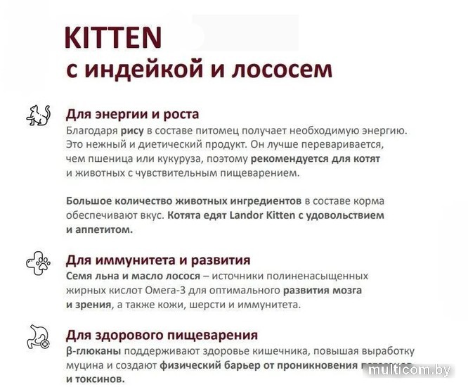 | Информация | Полнорационный сухой корм для котят с индейкой и лососем. Рис в составе корма облегчает пищеварение, что особенно важно для котят на этапе формирования ЖКТ. Рис является отличным источником углеводов, благодаря чему, питомец получает необходимое количество энергии. Большое количество животных ингредиентов в составе корма обеспечивают привлекательный вкус и высокую поедаемость. Семя льна и масло лосося – источники полиненасыщенных жирных кислот Омега-3 для оптимального развития мозга, зрения, а также кожи, шерсти и иммунитета. ?-глюканы поддерживают здоровье кишечника, повышая выработку муцина и создают физический барьер от проникновения патогенов и токсинов. |