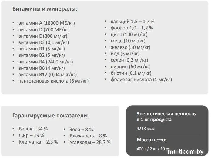 | Питательные вещества | Аналитические составляющие: Сырой протеин 34 %, сырой жир 19 %, сырая клетчатка 2,3 %, сырая зола 8 %, углеводы 28,7 %, влага 8 %. Добавки на 1 кг: Глюкозамин 350 мг, хондроитин 100 мг, L-карнитин 200 мг, Омега 3 – 0,46 %, Омега 6 – 3 %. |
