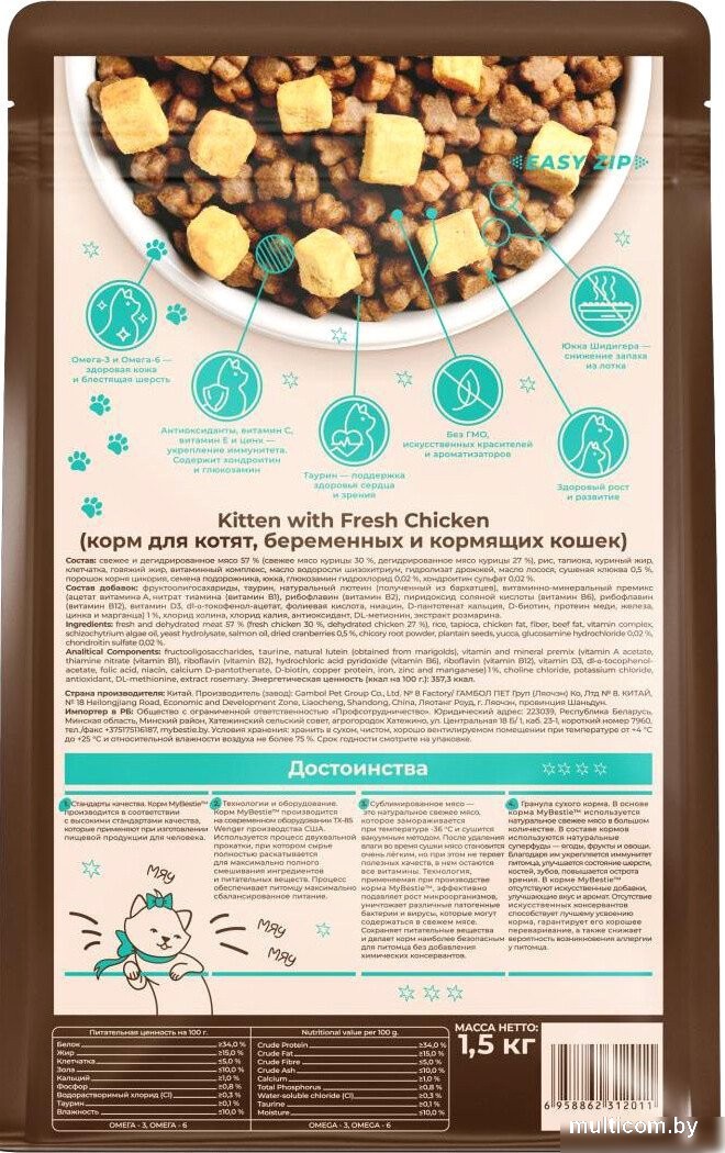 | Информация | - Корм MyBestie Kitten — это идеальный выбор для вашего котенка, обеспечивающий его здоровый рост и развитие. Сбалансированный состав, включающий свежее и дегидрированное мясо, гарантирует высокое содержание белка, необходимого для активного образа жизни вашего питомца. - Омега-3 и Омега-6 жирные кислоты в составе корма способствуют здоровью кожи и блестящей шерсти. Ваш котенок будет выглядеть великолепно и чувствовать себя комфортно благодаря тщательно подобранным ингредиентам. - Антиоксиданты, такие как витамин С и витамин Е, а также цинк, укрепляют иммунитет вашего питомца. Это особенно важно в период активного роста, когда котенок нуждается в дополнительной защите от болезней. - Корм MyBestie не содержит ГМО, искусственных красителей и ароматизаторов, что делает его безопасным и натуральным выбором для вашего любимца. Вы можете быть уверены, что ваш котенок получает только лучшее. - Таурин, входящий в состав корма, поддерживает здоровье сердца и зрения, что особенно важно для растущих котят. Заботьтесь о здоровье вашего питомца с помощью качественного питания. - Юкка Шидигера в составе корма помогает снизить запах из лотка, что делает уход за вашим котенком более комфортным для вас. Вы сможете наслаждаться временем, проведенным с вашим пушистым другом, не беспокоясь о неприятных запахах. - Корм MyBestie Kitten производится на современном оборудовании с соблюдением высоких стандартов качества, что гарантирует безопасность и питательную ценность каждого гранулы. Выбирая этот корм, вы делаете выбор в пользу здоровья и благополучия вашего котенка. |