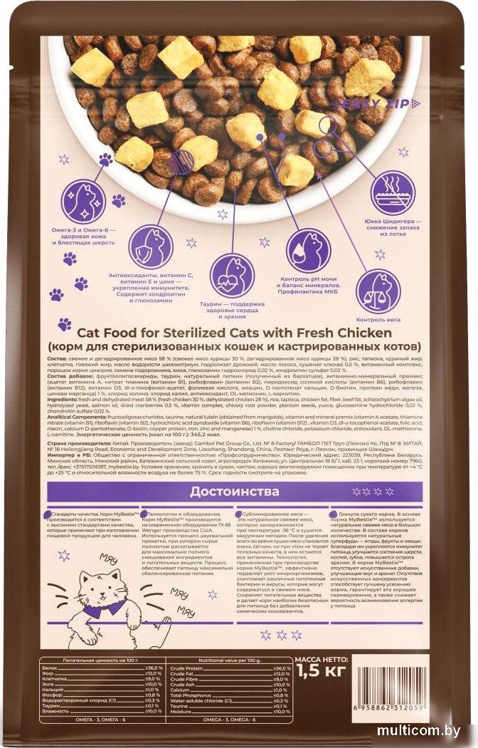 | Информация | - Корм MyBestie Стерилизованный — это идеальный выбор для заботливых владельцев кошек, стремящихся обеспечить своим питомцам здоровое и сбалансированное питание. Содержит высококачественное свежее и дегидрированное мясо, что способствует укреплению иммунной системы и поддержанию здоровья кожи и шерсти. Омега-3 и Омега-6 жирные кислоты делают шерсть блестящей, а также помогают поддерживать здоровье сердца и зрения благодаря добавлению таурина. - Важным аспектом корма является контроль рН мочи и баланс минералов, что помогает предотвратить мочекаменную болезнь (МКБ). Это особенно актуально для стерилизованных кошек, которые могут быть подвержены риску развития подобных заболеваний. Корм MyBestie также способствует контролю веса, что важно для поддержания здоровья вашего питомца. - Использование натуральных суперфудов, таких как ягоды и овощи, обогащает рацион витаминами и минералами, что положительно сказывается на общем состоянии здоровья. Кроме того, юкка Шидигера в составе корма помогает снизить запах из лотка, что делает жизнь с питомцем более комфортной. - Корм MyBestie производится на современном оборудовании с соблюдением высоких стандартов качества, что гарантирует безопасность и питательную ценность продукта. Сублимированное мясо сохраняет все полезные свойства, не содержит химических консервантов и подходит даже для самых чувствительных питомцев. - Выбирая MyBestie Стерилизованный, вы обеспечиваете своему любимцу полноценное и безопасное питание, которое поддерживает его здоровье и активность на протяжении всей жизни. |