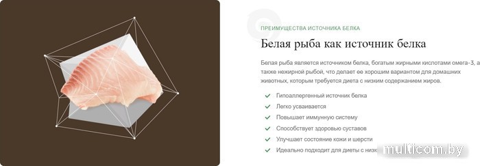 | Ингредиенты | белая рыба 42% (сушеная и тонко измельченная), мякоть картофеля сушеная, белок гороховый, батат, жир птичий, горох, жом сахарной свеклы, пивные дрожжи, лососевое масло, льняное семя, динамически микронизированный клиноптилолит (1%), целлюлоза, сухие яйца, экстракт цикория, маннаноолигосахариды (МОС), экстракт юкки, бархатцы сушеные (источник лютеина) |
