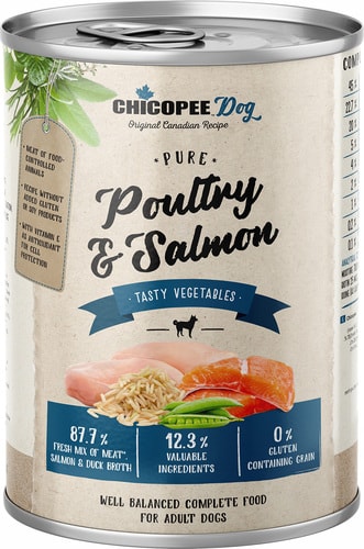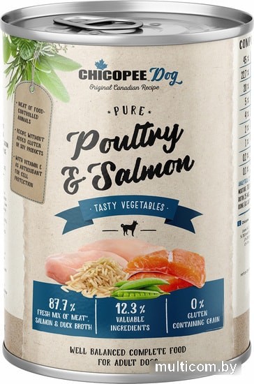 | Ингредиенты | 45,0% мясо и субпродукты (35% утка, 10% цыпленок), 22,7% утиный бульон, 20,0% рыба и ее производные (20% филе лосося) 5,0% рисовая мука,4,0% морковь, 2,0% горох, 1,0% минералы, 0,2% рапсовое масло, 0,1% инулин. |