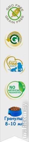 | Ингредиенты | Свежая треска (24%), дегидратированная треска (24%), рыбий жир (сельди), спельта (10%), овес (10%), пульпа сахарной свеклы, свиной жир, волокна гороха, дегидратированные белки птицы (курица, индейка), дегидратированные белки жвачных животных (ягненок, говядина), дегидратированный свиной белок, дегидратированный рыбный белок, кукуруза, сушеная морковь, сушеная люцерна, инулин, фруктоолигосахариды, дрожжевой экстракт (источник маннoолигосахаридов) дегидратированный сладкий апельсин (0,5%), сушеные яблоки, сушеный гранат, сушеный шпинат, подорожник (0,3%), сушеная черника, хлорид натрия, сухие пивные дрожжи, корень куркумы (0,2%), экстракт алоэ вера, глюкозамин, хондроитин сульфат. |
