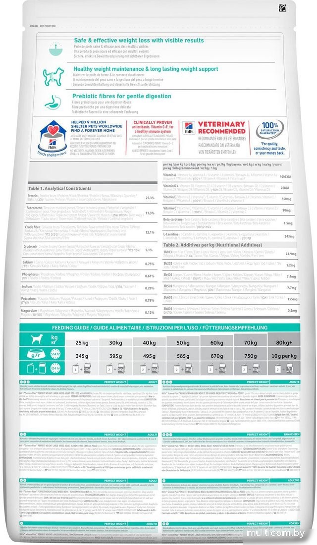 | Информация | Корм для взрослых собак крупных пород с курицей (содержание курицы 7%) — это полнорационный корм для взрослых собак крупных/гигантских пород (25+ кг) в возрасте от 1 года, имеющих небольшой избыточный вес или склонных к набору веса. Корм для взрослых собак обеспечивает вкусное, клинически проверенное питание для достижения и поддержания здорового веса. Формула с высоким содержанием белка и клетчатки, обогащенная L–карнитином и кокосовым маслом, помогает поддерживать метаболизм домашних животных._x000D_ Основные преимущества:_x000D_ безопасная и эффективная потеря веса с видимыми результатами;_x000D_ поддержание здорового веса и длительная поддержка веса;_x000D_ пребиотические волокна для легкого пищеварения._x000D_ _x000D_ Рекомендуется для: взрослые собаки в возрасте от 1 года и старше, которым требуется меньше калорий (т. е. собаки, которые менее активны, кастрированы или иным образом склонны к набору веса)._x000D_ _x000D_ Не рекомендуется для: щенки, беременные или кормящие собаки. Во время беременности или кормления собак следует перевести на другой корм._x000D_ _x000D_ Перевод на данный корм:_x000D_ постепенно в течение 7 дней переводите животное на новый корм, увеличивая его содержание по отношению к прежнему;_x000D_ обеспечьте питомцу свободный доступ к свежей воде._x000D_ _x000D_ Состав: пшеница, мука из кукурузного глютена, кукуруза, мука из курицы и индейки, мука из гороховых отрубей, целлюлоза, гидролизат белка, сушеные томатные выжимки, льняное семя, животный жир, сушеная мякоть свеклы, кокосовое масло (2.1%), минералы, сушеная морковь._x000D_ _x000D_ Аналитический состав: белок 25.3%, жир 11.3%, сырая клетчатка 12.1%, сырая зола 5.1%, кальций 0.75%, фосфор 0.61%, натрий 0.29%, калий 0.78%, магний 0.12%; на кг: витамин А 10012 МЕ, витамин D3 768 МЕ, витамин Е 550 мг, витамин С 90 мг, бета–каротин 1.5 мг, L–карнитин 343 мг._x000D_ _x000D_ Добавки на кг: 3b103 (железо) 74.9 мг, 3b202 (йод) 1.2 мг, 3b405 (медь) 7.4 мг, 3b502 (марганец) 7.7 мг, 3b603 (цинк) 155 мг, 3b801 (селен) 0.2 мг. |