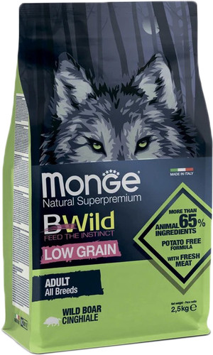 | Ингредиенты | Дегидрированное мясо дикого кабана (38%), животный жир 17% (сало очищенное на 99,5%), свежее куриное мясо (10%), желтый горох, тапиока, рис (5%),овес (5%), сухая свекольная пульпа, гидролизованный животный белок, минеральные вещества, пивные дрожжи, сухое яйцо (1%), семена льна (1%), дегидрированная морковь (1%), сухая томатная пульпа (1%), волокна гороха, юкка Шидигера, спирулина, сухая пульпа ананаса, сухая яблочная пульпа, сухая пульпа черники 0,5% (соответствует 4,3% свежей черники), сухая пульпа клюквы 0,5% (соответствует 4,3% свежей клюквы), сухая пульпа малины 0,5% (соответствует 4,3% свежей малины), ксилоолигосахариды (Х.О.S. 0,3 %), дрожжевые продукты (источник М.О.S.), хондроитина сульфат, глюкозамин, порошок молочного белка. |