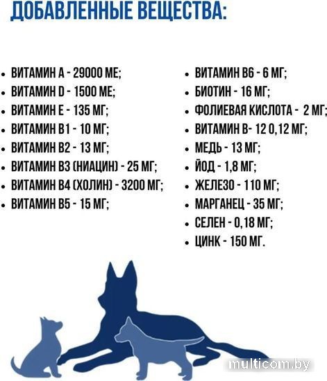 | Информация | Полноценный и сбалансированный рацион, который подходит для щенков в период прикорма, а также рекомендуется во время беременности и лактации у собак. Высокое содержание белка и жира обеспечит здоровье матери и удовлетворит потребности организма щенка на ранних стадиях развития. Корм обогащён незаменимыми аминокислотами, которые участвуют в формировании мышц. Глюкозамин, хондроитин, кальций и фосфор способствуют развитию суставов и скелета в целом. |