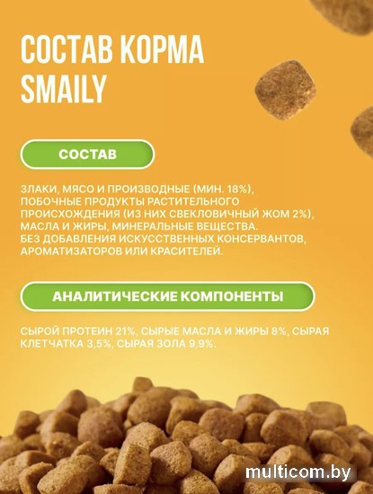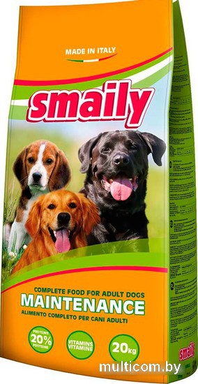 | Информация | ? Сухой корм для собак Smaily Adult Maintenance подходит для всех взрослых пород. ? Корм производится без добавления искусственных консервантов, ароматизаторов и красителей. ? Без гормонов, без ГМО. |