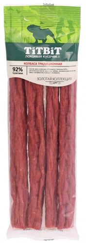 | Информация | Золотая коллекция – это линейка лучших лакомств TITBIT, разработанных при участии владельцев домашних животных и их питомцев. Колбаса «Традиционная» - это классическое мясное лакомство, приготовленное из тщательно отобранной телятины и добавлением кориандра и имбиря. |