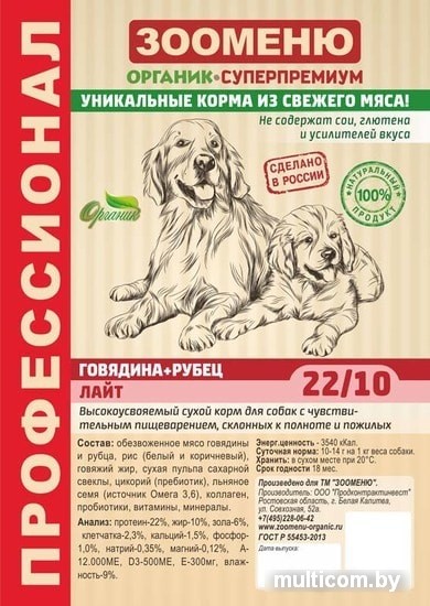 | Ингредиенты | обезвоженное мясо говядины и рубца, рис (белый и коричневый), говяжий жир, сухая пульпа сахарной свеклы, цикорий (пребиотик), льняное семя (источник Омега 3,6), коллаген, пробиотики, витамины, минералы. |
