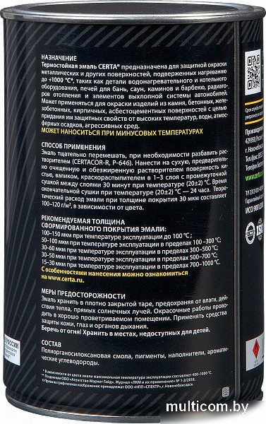 | Информация | Термостойкая краска CERTA — универсальна. Хорошо ложится на металлические, бетонные, кирпичные, цементные, оштукатуренные поверхности. Формула термостойкой эмали CERTA на кремнийорганической основе сохраняет паропроницаемость, защищает от коррозии, выдерживает нагрев до 1000°C, химическое воздействие растворами солей, минеральных масел, нефтепродуктов. |