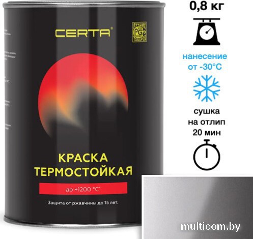 | Информация | Выдерживает нагрев до +1200 °C. 15 лет защищает от коррозии, влаги и возгорания (подтверждено испытанием ОАО НИИ ЛКП с ОМЗ «Виктория»). Термостойкая краска Certa сохраняет паропроницаемость. Выдерживает химическое воздействие растворами солей, минеральных масел, нефтепродуктов. Не требует предварительного грунтования. |