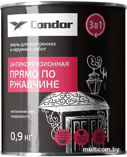 Информация? Эмаль CONDOR Антикоррозионная прямо по ржавчине 3в1 предназначена для окрашивания металлических поверхностей без предварительного грунтования.