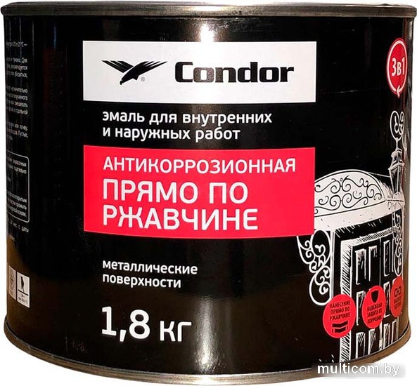 | Информация | ? Эмаль CONDOR Антикоррозионная прямо по ржавчине 3в1 предназначена для окрашивания металлических поверхностей без предварительного грунтования. ? Применяется для внутренней и наружной отделки. ? Образуемое глянцевое покрытие обеспечивает повышенную защиту от коррозии, атмосферных и механических воздействий. ? Сочетает в себе свойства антикоррозионной грунтовки и декоративной эмали, что упрощает и ускоряет процесс окрашивания. |