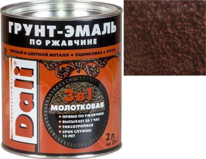 | Информация | Защитно-декоративная обработка различных металлических поверхностей, в том числе пораженных точечной или сплошной коррозией с толщиной ржавчины до 100 мкмОбласть применения.Внутри и снаружи помещений по ЛЮБЫМ металлическим поверхностям, новым и ранее окрашенным:- стальным и чугунным (решетки, ограды, гаражи, ворота и пр.);- цветным металлам (цинк, медь, алюминий);- поверхностям из оцинкованного металла (профнастил) и нержавеющей стали.- допускается нанесение на деревянные поверхности, влажностью не выше 20%, эксплуатируемые внутри помещений.Состав: модифицированная алкидная смола, восстановитель металла, ингибитор коррозии, пигменты, наполнитель, антикоррозионные и функциональные добавки, растворитель.Разбавление: допускается, но не более 10% от общей массы состава.Время высыхания (при t° +20±2°C):- на отлип – 2 часа;- межслойная сушка – от 5 минут до 3 часов, либо через 7 суток;- окончательный набор прочности покрытия – до 7 суток.Свойства:- совмещает свойства преобразователя ржавчины, антикоррозионного грунта и декоративной эмали;- 3-х ступенчатая система защиты: барьерная + антикоррозионная + протекторная;- допускается нанесение прямо по ржавчине;- обладает высокими показателями адгезии к новым, ранее окрашенным и пораженным коррозией поверхностям;- образует долговечное суперпрочное покрытие с эффектом молотковой чеканки;- устойчива к воздействию воды, масел, слабых кислот и щелочей;- устойчива к выгоранию, не разрушается под воздействием УФ-излучения;- атмосферостойкая, выдерживает колебания температур от -40?C до +80?С;- легко наносится, тиксотропная, образует ярко выраженных молотковый эффект даже на вертикальных поверхностях;- отличается высокими показателями укрывистости и низким расходом. |
