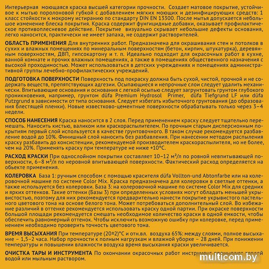 | Информация | ? Dufa Kuche & Bad - это интерьерная моющаяся краска высшей категории прочности, которая создает матовое покрытие, устойчивое к мытью поролоновой губкой с добавлением мягких моющих и дезинфицирующих средств. После мытья допускается небольшое изменение блеска покрытия. ? Эта краска предназначена для окрашивания стен и потолков в сухих и влажных помещениях по минеральным поверхностям, деревянным поверхностям, ДВП, гипсокартону и т.п. Она идеально подходит для окрасочных работ в кухне, ванной комнате и прочих влажных помещениях, а также в помещениях общественного назначения с высокой проходимостью. ? Краска может использоваться в детских учреждениях и помещениях административной группы лечебно-профилактических учреждений, так как содержит фунгицидные добавки и оказывает профилактическое противоплесневое действие. ? Покрытие визуально скрывает небольшие дефекты основания, легко наносится, практически не имеет запаха и не содержит растворителей. ?? Представленные цвета и оттенки могут отличаться от действительных в зависимости от настроек Вашего монитора. Свойства: моющаяся, укрывистая, тиксотропная, экологичная, быстро сохнет, высшая категория прочности, без растворителей. |