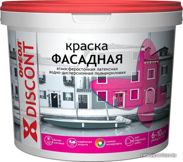 | Информация | Краска предназначена для окрашивания наружных поверхностеи? жилых и административных здании?. Краску можно наносить на бетонные, кирпичные, оштукатуренные, деревянные и другие пористые поверхности, подвергающиеся атмосферным воздеи?ствиям. |