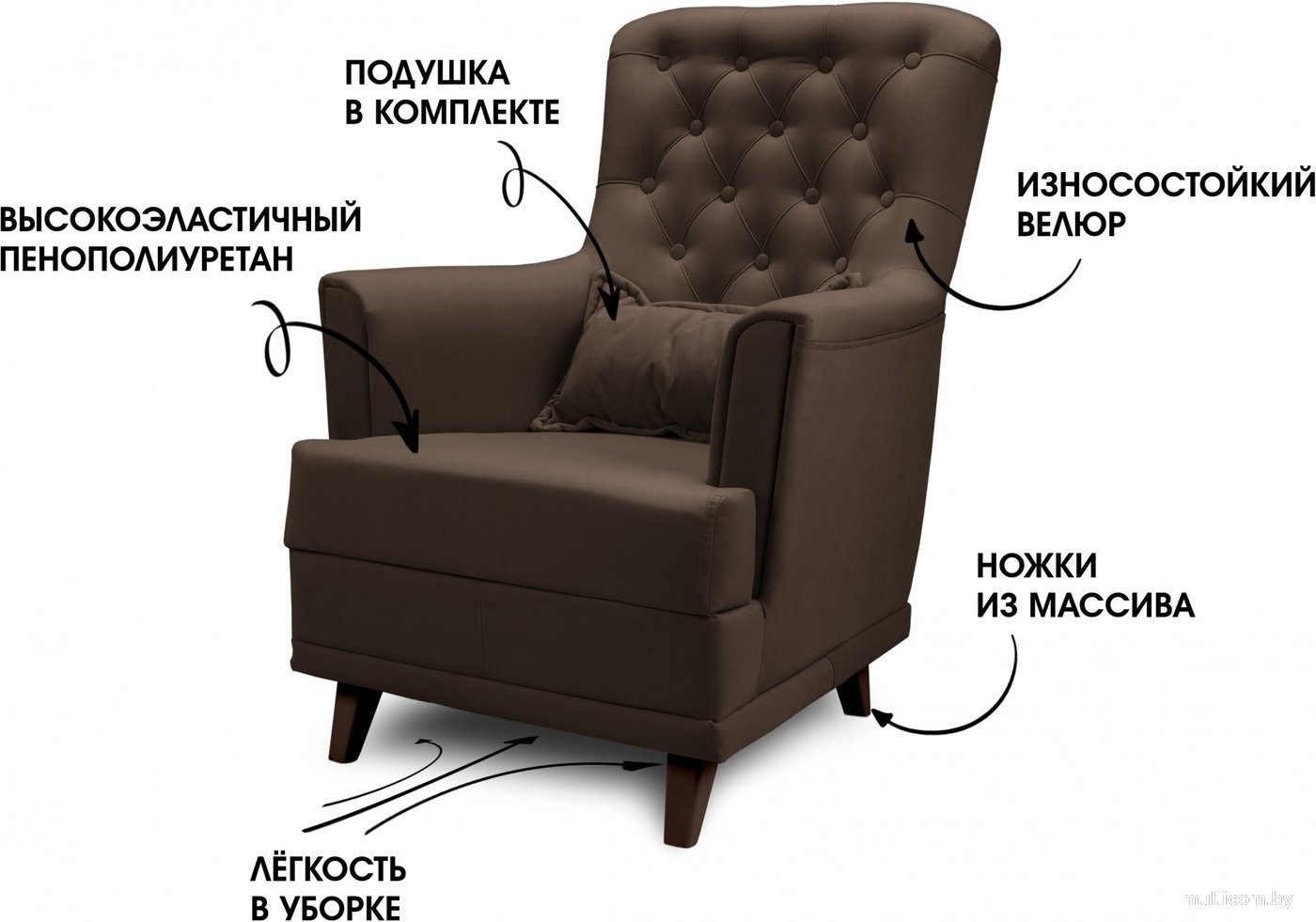 | Информация | - Ножки кресла выполнены из надежного материала, что обеспечивает отличную прочность и долговечность. Это кресло идеально подходит для тех, кто ценит комфорт и стиль в интерьере. - Широкие подлокотники добавляют удобства, позволяя вам расслабиться и насладиться просмотром любимого фильма или чтением книги. Это отличный выбор для создания уютной атмосферы в вашем доме. - Спинка кресла украшена пуговицами, что придает мебели уникальный и элегантный вид. Такой дизайн добавляет шарм и делает кресло не только функциональным, но и стильным элементом вашего интерьера. - Это кресло станет отличным дополнением для вашего дома, обеспечивая комфорт и стиль в каждой детали. |