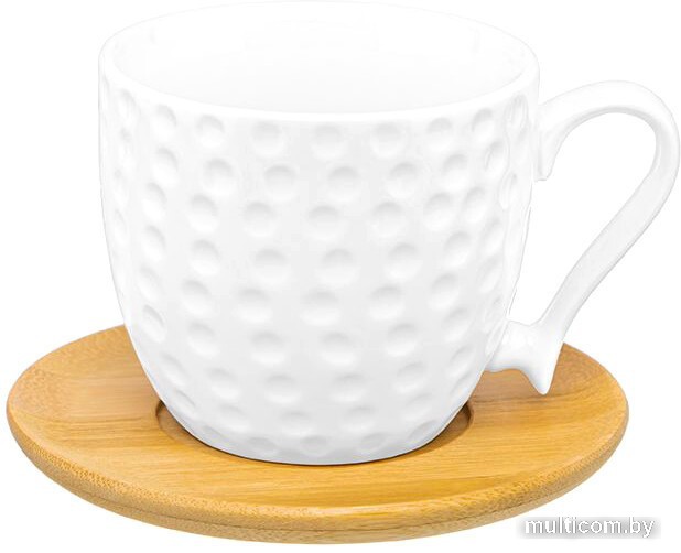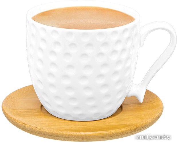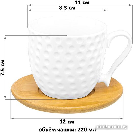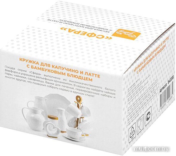 | Информация | Чашка серии на 220 мл с бамбуковой подставкой поможет провести множество вкусных завтраков с капучино или латте, а также уютных вечеров с любимым горячим напитком. Чашка выполнена из высококачественного белого фарфора и украшена рельефными узорами. Фарфоровые чашки отличаются от керамических повышенной плотностью. Они не впитывают цвет кофе, чая, глинтвейна, других горячих напитков и не деформируются от влаги, чему может быть подвержена керамика. Кружку без тарелки можно использовать в СВЧ и ПММ. Бамбуковую тарелку нельзя замачивать. |
