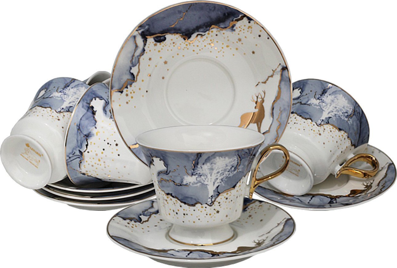 | Информация | - В наборе представлено 12 предметов, включая 6 чашек и 6 блюдцев. - Каждая чашка имеет объем 0.25 литра, что идеально подходит для чая или кофе. - Обратите внимание, что данный набор не предназначен для использования на плите. - Изготовлен из качественного фарфора, который придаёт элегантный вид. - Ручки чашек также выполнены из фарфора, что обеспечивает гармоничный дизайн. - Цветовая гамма включает белый с золотистым кантом, синий и оригинальные рисунки. - Не рекомендуется мыть в посудомоечной машине для сохранения внешнего вида. |