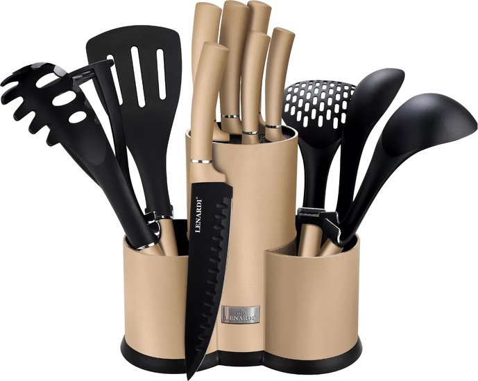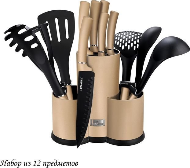 | Информация | Набор кухонных приборов: - половник; - шумовка; - ложка для спагетти; - подставка; - лопатка с прорезями; - картофелемялка; - ложка; - поварской нож (21 см); - нож для чистки овощей (9 см); - универсальный нож (13 см); - нож для хлеба (21 см); - шеф нож (21 см). |