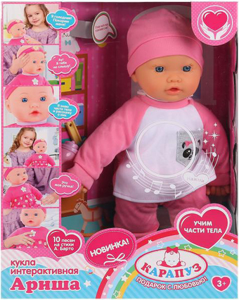 | Информация | Интерактивная кукла «Ариша» - новинка ТМ «Карапуз» - представляет собой озвученную игрушку, которая поёт 10 песен на стихи А. Барто. Функции: - знает части тела и рассказывает о них - режим экзамен Её очаровательное личико детально проработано и вызовет у ребёнка самые трепетные чувства. У куколки мягкое тело, его приятно обнимать и убаюкивать. Ариша одета в модный комбинезончик с закрытыми ножками и шапочку с ушками. Одежду легко снять и надеть. |