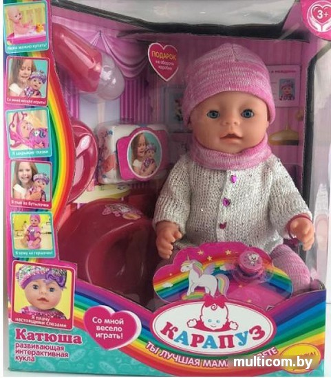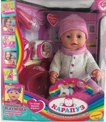 | Информация | Развивающая интерактивная кукла «Катюша» ТМ «Карапуз» станет прекрасным подарком для вашего ребёнка: - пьёт из бутылочки - ходит на горшок - можно купать - плачет настоящими слезами - подарок на обороте коробки Этот милый пупс, с детально проработанным личиком, обязательно понравится вашей малышке. Катюша одета в милый вязаный костюмчик и шапочку. Одежда легко снимается и надевается. С Катенькой девочка может играть в самые разные игры, гулять с ней, петь песни, кормить, переодевать, рассказывать сказки и укладывать спать. |