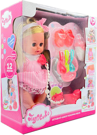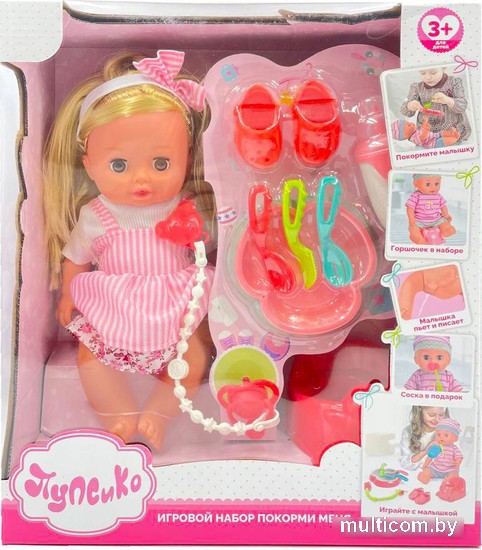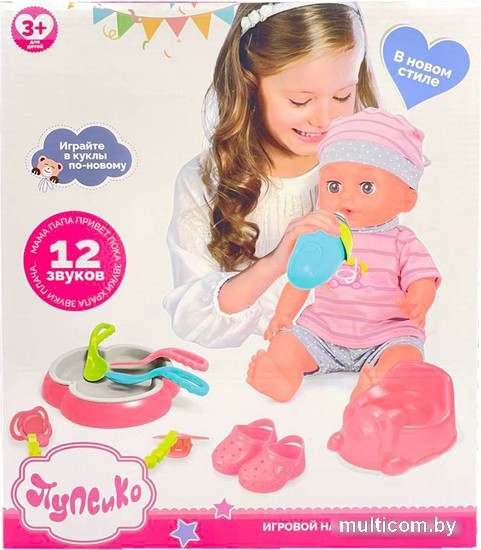 | Комплектация | горшок, бутылочка, подгузник, кукла-младенец, одежда/обувь, посуда, пустышка |