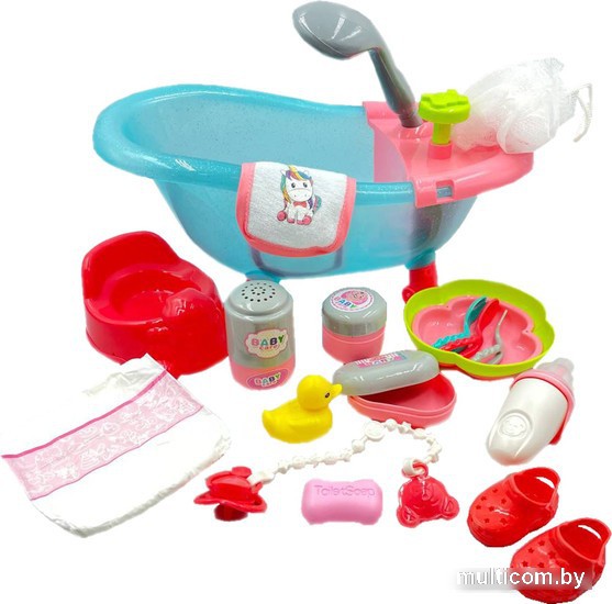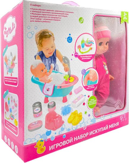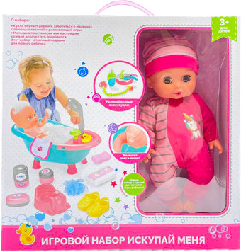 | Комплектация | кукла, ванночка с душем + 4 ножки для ванной, мыльница + мыло, мочалка, детский крем, детская присыпка, полотенце, уточка, горшок, памперс, бутылочка, соска на прищепке, тарелка, ложка, вилка, ножик, обувь 1 пара |
