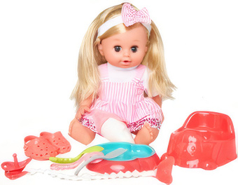 | Информация | Интерактивная кукла выполнена из безопасного приятного на ощупь материала. Кукла издает 12 вариантов звуков (икает, отрыгивает, спит, целует, капризничает, кашляет, гулит, чихает, папа, мама, плачет, смеется). Батарейка входят в комплект, нужно удалить блокирующий язычок, расположенный в звуковом модуле на животике куклы (модуль нужно вытащить из куклы, язычок находится сзади). Куколка может пить и писать. В комплект входят: кукла 32 см, горшок, тарелка, нож, вилка, ложка, пара обуви, соска на прищепке, бутылочка. Игрушка одета в красивую стильную одежду. Размеры коробки 30?35?13 см. Играя с куклой, ребенок может изучать части тела и черты лица. Это способствует развитию фантазии и коммуникативных навыков малыша. |