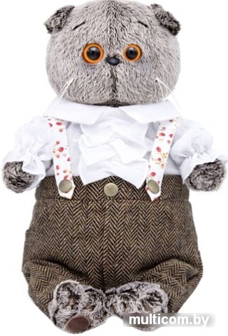 | Информация | Кот в невероятно романтичном комплекте – белой рубашечке с жабо и пышными рукавами, коричневых штанишках с трогательными подтяжками с розочками. Рубашечка из тонкого хлопка с выработкой, штанишки из плотного твида в ёлочку и подтяжки из репсовой ленты на металлических кнопках. |