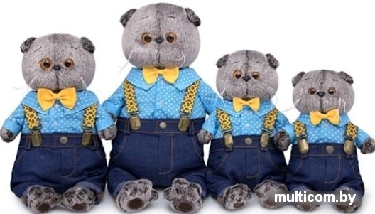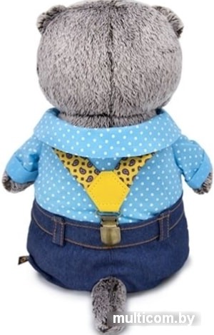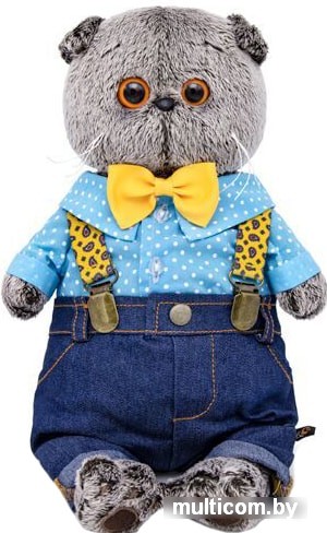 | Информация | На Басике модные джинсы классического цвета индиго, сшиты с отворотами, отстрочкой, кармашками и шлёвками. Джинсы в комплекте с оригинальными подтяжками с широкими помочами из плотной эластичной тесьмы одуванчикового цвета с принтом Paisley и вставкой из жёлтой экокожи. Также на Басике милая х/б рубашечка голубого цвета в белый мелкий горошек. Весь ансамбль украшает галстук бабочка ярко-жёлтого цвета. |