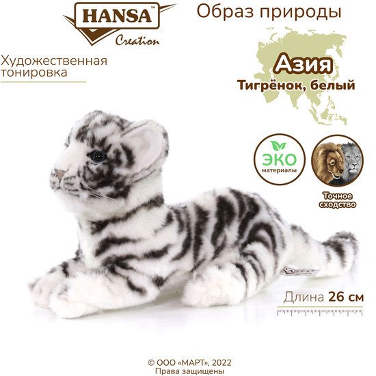 | Информация | Реалистичная мягкая игрушка Тигрёнок, белый бренда HANSA Creation выполнена из высококачественного искусственного меха разных фактур, тщательно подобранных и обработанных вручную с использованием технологий тримминга и художественной тонировки, что придает игрушке точное сходство с оригиналом. Игрушка выполнена в уменьшенном масштабе: высота - 16 см, длина - 26 см. Плюшевый тигрёнок сшит с соблюдением всех пропорций, внешних особенностей и окраса животных этого вида, распространённого в Азии. Уникальные игрушки ручной работы от ХАНСА Криэйшен дарят положительные эмоции, всем кто любит животных, поражая своим сходством с оригиналами в живой природе. Это чудесная возможность завести милого плюшевого питомца, точь в точь как живого или сделать необычный подарок на любой праздник как ребенку, так и взрослому! Игрушка может стать оригинальным декором для детской, спальни или гостиной. Сегодня все белые тигры, обитающие в зоопарках, происходят от самца по имени Мохан. Весной 1951 года магараджа Ревы на охоте обнаружил логово с четырьмя тигрятами, один из которых был белой масти. Его забрали в зверинец магараджи, где он прожил 12 лет, дав многочисленное потомство.Слоган «Ханса - образ природы» полностью отражает миссию бренда. Образы бренда HANSA Creation воодушевляют на изучение мира животных, их повадок, среды обитания, а также напоминают о необходимости защиты нашей природы. HANSA Creation сотрудничает с крупнейшими фондами охраны природы, такими как WWF, РГО, природными заповедниками Африки, сохраняя в игрушках образы редких и исчезающих животных. Компания вносит свой вклад в поддержание экологии окружающей среды, используя для набивки игрушек пищевой пластик повторной переработки. В ассортименте мягких игрушек бренда ХАНСА Криэйшен более 500 образов размером от 7 см до 4,5 м, выполненных в масштабе или в натуральную величину life size. Соберите тематическую коллекцию животных России или любого континента, игрушки на руку для малышей, или составьте интерьерную композицию. Мягкая игрушка из раздела - ИГРУШКА ГОДА |