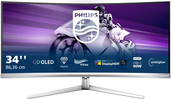 | Информация | Потрясающая цветопередача игрового монитора Evnia QD OLED поможет вам окунуться в игровой мир. Инновационная технология Ambiglow преобразит игровую среду. С нашим изогнутым дисплеем вы не упустите ни единой детали в игре. Технология QD OLED для точной и насыщенной цветопередачи QD-OLED означает гибридный подход с использованием панелей OLED и технологии квантовых точек. Сочетая лучшие качества обеих технологий, QD-OLED гарантирует высокую контрастность, глубокие оттенки черного и неограниченный угол просмотра, а также более высокую пиковую яркость и насыщенные цвета. VESA Certified ClearMR: для точного тестирования на размытие Раньше измерение размытия на экране проводились с помощью MRPT. VESA Certified ClearMR является альтернативой MRPT и предназначена для воссоздания истинного размытия через тестирование цифровой камерой на высокой скорости. Мониторы, которые проходят тестирование VESA Certified ClearMR, гарантируют точные показатели размытия изображения. Каждая сертификация использует определенный диапазон CMR: доступны уровни ClearMR 3000, 4000, 5000, 6000, 7000, 8000 и 9000. Дисплей с изогнутым корпусом для максимальных впечатлений Настольные мониторы с изогнутым корпусом моментально завладеют вашим вниманием. Изогнутый корпус помогает сконцентрироваться, вовлекая пользователя в процесс. DisplayHDR™ TrueBlack 400 для невероятной детализации в тенях Этот монитор Philips имеет сертификацию VESA DisplayHDR™ True Black 400. Он предлагает потрясающе точную детализацию в тенях и передачу глубоких оттенков черного, обеспечивая более яркие впечатления от просмотра, чем другие мониторы с той же пиковой яркостью. Этот мониор Philips имеет несколько режимов HDR для разных сценариев использования: HDR Игровой, HDR Кино, HDR Фото и VESA DisplayHDR. Глубина цвета 10 бит обеспечивает плавный переход между оттенками На этом дисплее Philips с глубиной цвета 10 бит вы сможете по достоинству оценить исключительную точность цветопередачи, соответствующей профессиональным стандартам. По сравнению с обычными 8-битными дисплеями этот монитор Philips предлагает более плавный переход между цветовыми оттенками. Кристально чистое изображение с UltraWide QHD 3440 x 1440 пикселей Эти мониторы Philips обеспечивают кристально чистое изображение с разрешением UltraWide Quad HD 3440 x 1440 пикселей. Мониторы оснащены высокопроизводительными панелями с высокой плотностью пикселей и широким углом обзора 178/178, благодаря чему изображения и графика буквально оживают на глазах. Формат UltraWide 21:9 увеличивает производительность, позволяя проводить наглядное сравнение нескольких документов одновременно и с легкостью просматривать таблицы с большим количеством столбцов. Мониторы Philips с кристально чистым изображением подойдут и требовательным к деталям профессионалам, работающим с программами CAD-CAM, и финансистам, имеющим дело с огромными таблицами. AMD FreeSync™ Premium Pro: плавный игровой процесс с минимальной задержкой Для геймеров не должно существовать выбора между низкой частотой обновления и малой производительностью в играх. AMD FreeSync™ Premium Pro создает игровой процесс в формате HDR — сочетание плавного обновления изображения и высокого динамического диапазона при сохранении низкой задержки обновления. Более качественный звук благодаря DTS Sound™ DTS Sound — это система обработки звука, которая оптимизирует качество аудиовоспроизведения при прослушивании музыки, просмотре филь