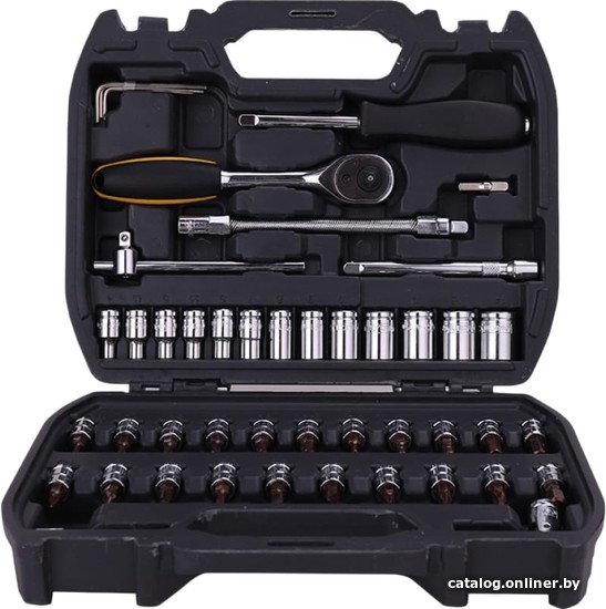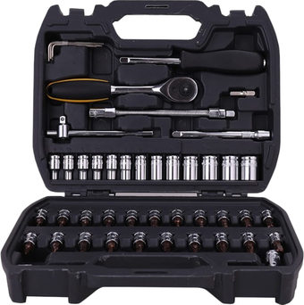 | Комплектация | - 1/4" универсальный шарнир - 1/4" скользящий стержень - 1" 6,3 мм вращающийся шарнир - 1" 6,3 мм вращающийся стержень - 1/4" трещоточный ключ - 1/4" шарнирный кардан - 4 шестигранных ключа: 1,27, 1,5, 2, 2,5 мм - 2 удлинителя 1/4 дюйма: 2 ", 4" - 13 головок 1/4 дюйма: 4, 4,5, 5, 5,5, 6, 7, 9, 10, 11, 12, 13, 14 мм - 1/4" Торцевые головки-биты: PZ1, PZ2, PZ3, PH1, PH2, PH3, H3, H4, H5, H6, H7, H8, T10, T15, T20, T25, T30, T40 |