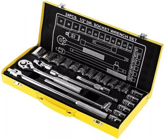| Комплектация | Металлический кейс Храповой ключ 45 зубцов Торцевые головки 12,5 мм: 10, 11, 12, 13, 14, 15, 16, 17, 18, 19, 20, 21, 22, 24, 27, 30, 32 мм Универсальный шарнир Скользящий шток 12,5 мм (250 мм) Удлинитель 12,5 мм (380 мм) Удлинитель 250 мм Удлинитель 125 мм |