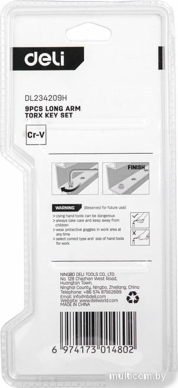 | Информация | Набор шестигранных удлиненных ключей DELI torx dl234209h материал Cr-V, 9 шт. 104515 предназначен для закручивания и откручивания винтов, саморезов, конфирматов, имеющих углубление в виде шестилучевой звезды типа Torx. Ключи применяются во многих отраслях деятельности — в авторемонте, сборке мебели, в пластиковых окнах, велосипедах и мототехнике, в бытовой технике. Ключи выполнены из качественной и прочной хромованадиевой стали, благодаря чему отличаются долговечностью и надежностью. Набор поставляется в пластиковом держателе для удобного хранения и транспортировки. |