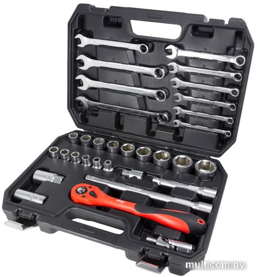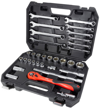 | Комплектация | 1/2: 15 шт. Головки: 8,10,11,12,13,14,15,17,18,19,22,24,27,30,32мм 2 шт. свечные головки: 16,21 мм 2 удлинителя: 125, 250 мм 1 шт. 3-сторонний адаптер 1шт трещетка Шарнирный кардан 1 шт. Комбинированные ключи, 10 шт.: 8,9,10,11,12,13,14,17,18,19мм |