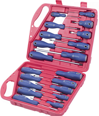 | Комплектация | • Отвертки Крестовые Phillips, серии 041: 0 х 60, 0 х 75, 1 х 75, 2 х 38, 2 х 100, 2 х 150, 3 х 150; • Отвертки Шлицевые Slotted, серии 040: 3 х 75, 4 х 100, 5.5 х 75, 6.5 х 38, 6.5 х 100, 8 х 150, 8 х 150 (силовая); • Отвертки Звезда TORX, серии 043: Т10 х 100, Т15 х 100, Т20 х 100, Т25 х 100, Т27 х 100, Т30 х 100. |