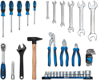 | Комплектация | Инструменты в наборе трещотка (1 шт.), отвертка (5 шт.), клещи (1 шт.), пассатижи (1 шт.), молоток (1 шт.), бокорезы (1 шт.), ключ гаечный (16 шт.) Трещотка 1/2? (72 зубца) Отвертки шлицевая (SL) (3 шт.), крестовая (PH) (2 шт.) Клещи переставные (1 шт.) Доп. комплектация рейка магнитная Оснастка Оснастка головки (12 шт.) Головки торцевые (12 шт.) Торцевые головки 1/2? (10, 12, 13, 14, 15, 17, 19, 22, 24, 27, 30, 32 мм) Ключи угловой шестигранный (9 шт.), разводной (1 шт.), рожковый (6 шт.) Размер ключа 8 мм, 10 мм, 12 мм, 13 мм, 14 мм, 17 мм, 19 мм, 22 мм, 24 мм, 1.5 мм, 2 мм, 2.5 мм, 3 мм, 4 мм, 5 мм, 6 мм, 27 мм, 30 мм, 32 мм |
