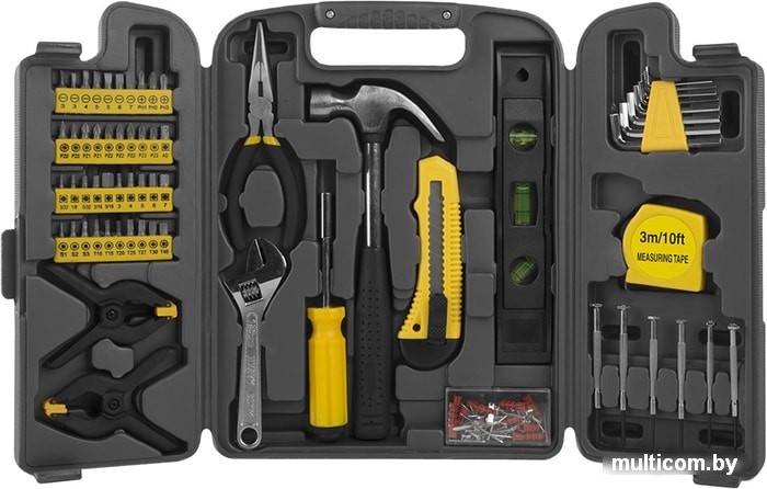 | Комплектация | Тонкогубцы 150 мм; Разводной ключ 150 мм; Молоток 225 г; Уровень 230 мм; Струбцины 100 мм; Держатель для бит; Рулетка 3 м; Нож; Шестигранные ключи 8 шт; Отвёртки для точной механики 6 шт; Биты 40 шт; Набор аксессуаров 80 шт. |