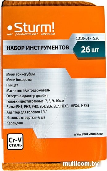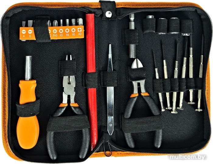 | Комплектация | Мини тонкогубцы. Мини бокорезы. Пинцет. Магнитный битодержатель. Отвертка-адаптер для бит. Адптер для головок 1/4" Часовые отвертки -6шт. Карандаш Головки шестигранные: 7,8,9,10мм Биты: PH1, PH2, PH3, SL4, SL6, SL7, HEX3, HEX4, HEX5 |