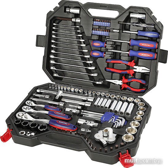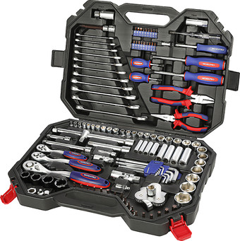 | Комплектация | 7 шт торцевые головки 1/2" CR-V: 20, 21, 22, 24, 27, 30, 32 мм 11 шт торцевые головки 3/8" CR-V: 9, 10, 12, 13, 14, 15, 16, 17, 18, 19 мм 4 шт удлинённые торцевые головки 3/8" CR-V: 13, 14, 15, 17 мм 10 шт торцевые головки 1/4" CR-V: 4, 5, 6, 7, 8, 9, 10, 11, 12, 13 мм 4 шт удлинённые торцевые головки 1/4" CR-V: 8, 9, 10, 12мм 4 шт ударные торцевые головки 1/2" CR-V: 17, 19, 21, 23 мм 2 шт свечные головки 3/8" CR-V: 16 мм, 21 мм 1 шт торцевая головка для крышки цилиндра CR-V12,5 мм: T52x100L 5 шт. удлинители CR-V: 1/4"x50мм, 3/8"x75мм,3/8"x150мм, 1/2"x125мм, 1/2"x250 мм 3шт универсальные шарниры CR-V: 1/4", 3/8", 1/2" 1 шт. 3-сторонний адаптер 1/2" CR-V 2 шт. адаптеры CR-V: 1/2" (m) x 3/8" (f), 1/4" (m) x 3/8" (f) по 1 шт: муфта 1/4" CR-V, вращающаяся рукоятка 1/4" CR-Vтрещотка 1/4", трещотка 3/8",трещотка 1/2" 11 шт комбинированные гаечные ключи CR-V: 8, 9, 10, 11, 12, 13, 14, 16, 17, 18 19 мм 17 шт биты 3/8" CR-V/s2 : Т20, Т30, Т40, Т45, Т50,Т55, Т60, FD5.5, FD6.5, PH1, PH2, PH1, PZ2,H3, H4, H5, H6 по 1 шт: плоскогубцы 175мм, длинногубцы 160мм ,торцевой штифтовой ключ, съёмник масляного фильтра, тестер напряжения 4 шт хром-молибденовые отвертки: 6x100мм, 6x38мм, PH2x100мм, PH2x38 мм 18 шт биты 25мм S2 с держателем 9 шт длинные шестигранные ключи CR-V: 1.5, 2, 2.5, 3, 4, 5, 6, 8, 10 мм |