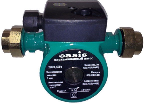 | Информация | Циркуляционный насос «Oasis» обеспечивает циркуляцию воды в системах отопления, а также системах обогрева полов. Прибор имеет небольшие габаритные размеры и вес, работает практически бесшумно и потребляет мало электроэнергии. Циркуляционные насосы «Oasis» применяют в загородных домах площадью свыше 100 кв.м, так как естественная конвекция не сможет обеспечить равномерный прогрев всех отопительных приборов. |
