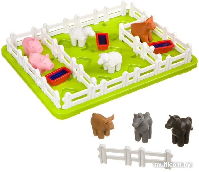 | Комплектация | Игра содержит игровую доску с 4 зафиксированными заборами по периметру, 2 фигурки лошади, 2 коровы, 2 овцы, 2 свиньи, 3 корытца с водой, 3 ограды, буклет с 60 заданиями и их решениями. |
