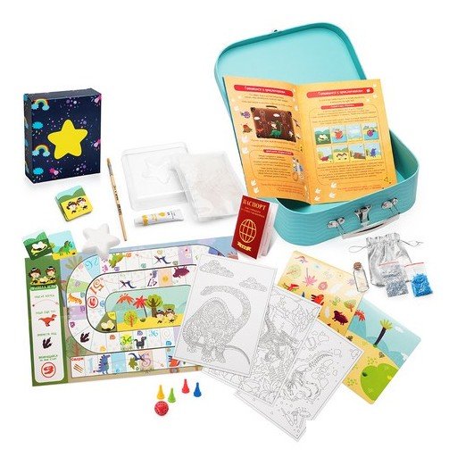 | Комплектация | акриловая краска; паспорт путешественника; набор для создания поделки "Талисман"; игровое поле; кисточка; книжка-инструкция с заданиями; фишки; открытки-раскраски; набор наклеек; карточки; набор для создания "Звезды путешественника" из гипса; кубик |